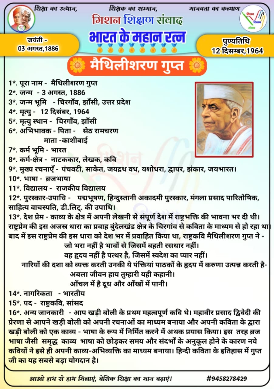 मैथिलीशरण गुप्त : खड़ी बोली हिंदी के प्रथम राष्ट्रकवि।