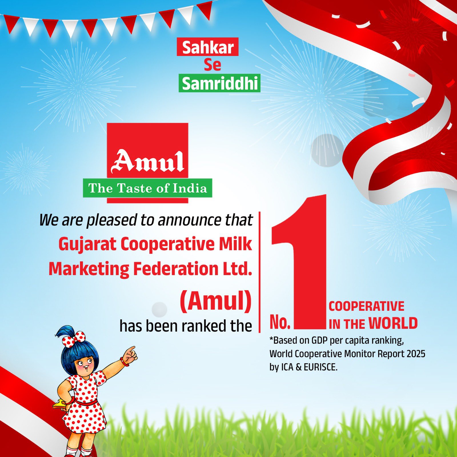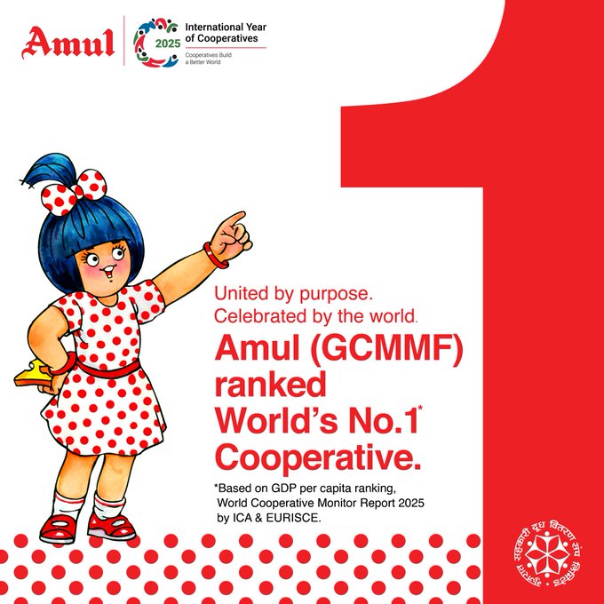 To the 36 lakh farmers behind Amul and the billions of consumers who trust us, thank you for making us the world’s No. 1 cooperative (ranking by turnover to GDP per capita, World Cooperative Monitor Report 2025, ICA & EURICSE). pic.twitter.com/et8GUo42Td