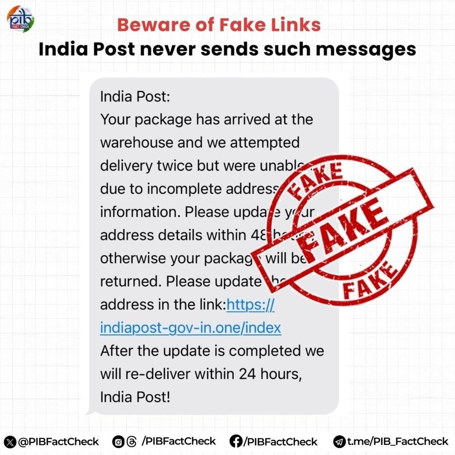 The Press Information Bureau (PIB) Fact Check division has confirmed that this message is fake and warned that India Post never sends such alerts requesting address updates via links.