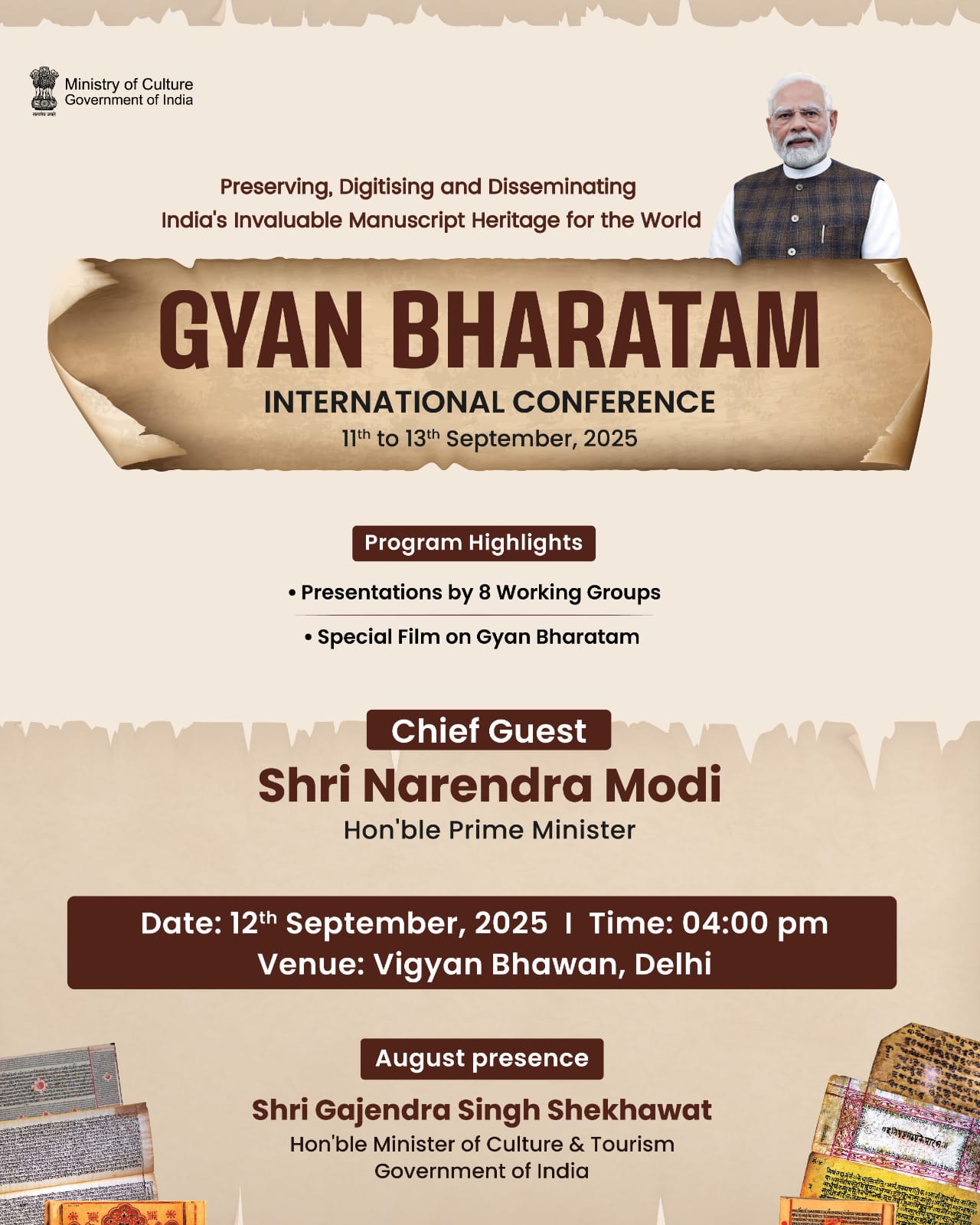 PM @narendramodi participated in the International Conference on #GyanBharatam in New Delhi. @4.00 pm today on 12th September 2025. Tweets — MyGovIndia (@mygovindia) September 12, 2025