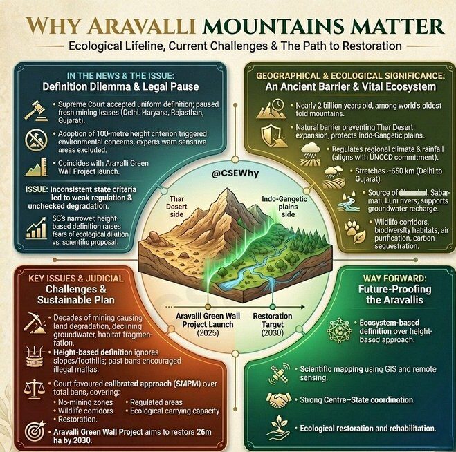 Save Aravalli : How SC’s 100m Contour Cracks Down on Mining. The Supreme Court of India’s November 2025 order provides a uniform definition and strict protections for the Aravalli hills to halt degradation and ensure sustainable management. It addresses ecological crises from human interference while mandating restoration, balancing conservation with regulated development.