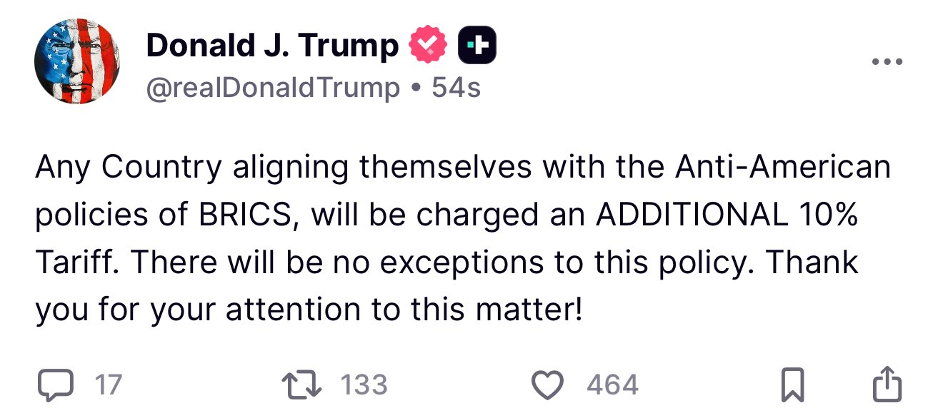 HOLY SH*T 🚨 Donald Trump just announced an ADDITIONAL 10% TARIFF on any Country aligning with Anti American BRICS policies pic.twitter.com/9meoQXVder
